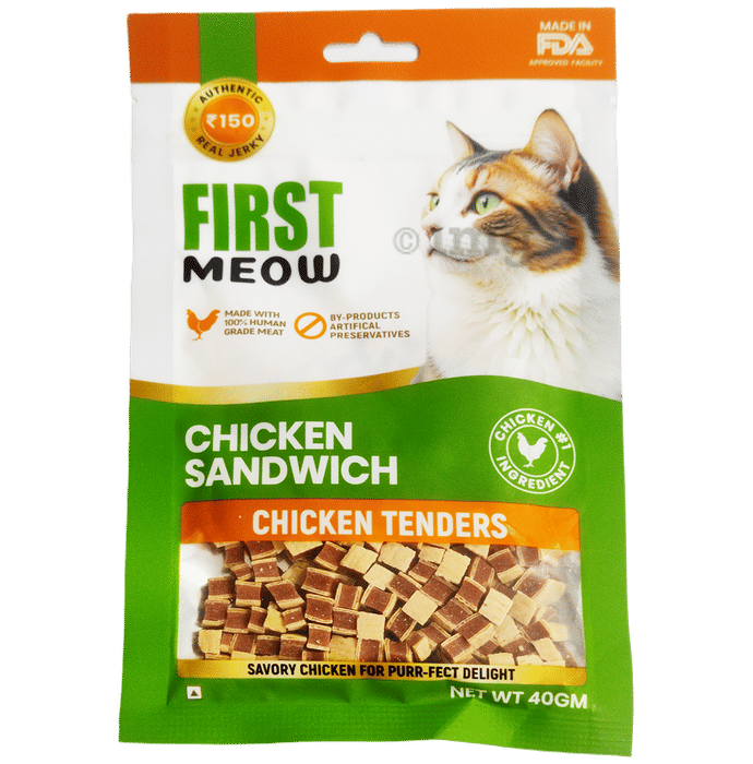 First Meow Chicken Sandwich is made with chicken, fish, and vegetable protein blended into tender bite-sized pieces for cats. It contains a balanced composition of protein, fibre, and essential nutrients that can help support overall wellness. These treats are designed to provide cats with a savoury snack that can help maintain daily nourishment along with their regular meals.