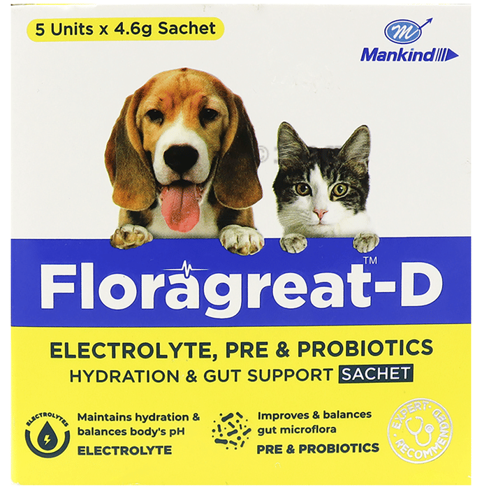Floragreat-D Sachet (4.6gm Each) is a veterinary feed supplement formulated for dogs and cats to support hydration and gastrointestinal health. Each 4.6 g dual-pack sachet contains a blend of electrolytes—Sodium Chloride, Sodium Citrate, Potassium Chloride, and Dextrose Anhydrous—to help maintain fluid balance and replenish lost minerals. Additionally, the formulation includes a probiotic complex of Streptococcus faecalis, Clostridium butyricum, Bacillus mesentericus, and Bacillus coagulans to support digestive balance and gut microflora. It can be used during episodes of diarrhoea or digestive stress to assist recovery and help maintain wellbeing.