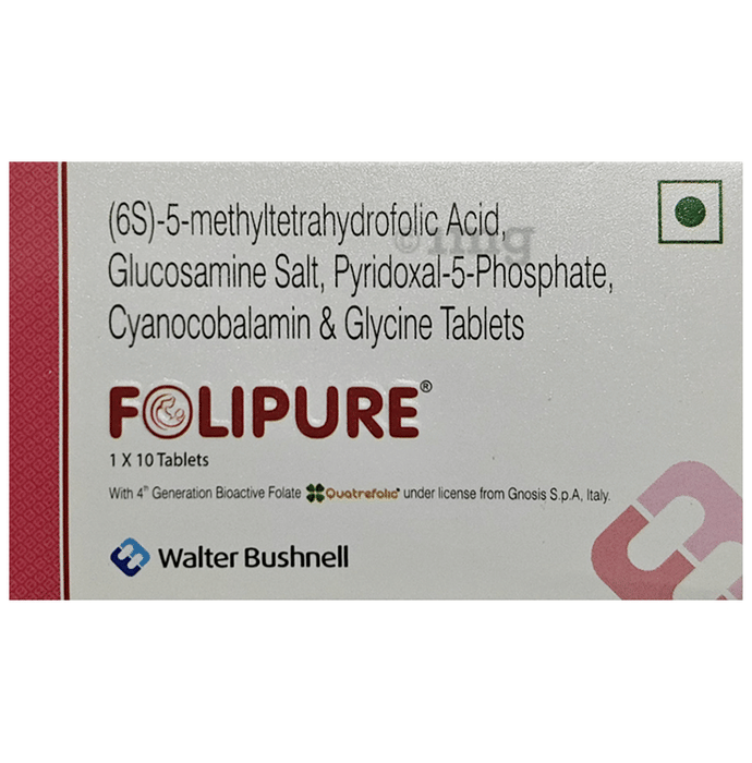 Folipure Tablet is a health supplement containing (6S)-5-Methyltetrahydrofolic Acid Glucosamine Salt (Quatrefolic®), Pyridoxal-5-Phosphate (Vitamin B6), Cyanocobalamin (Vitamin B12), and Glycine. This formulation offers a bioactive folate form, which can help support increased dietary needs in pregnant women. Each tablet delivers carefully balanced levels of key nutrients that can help in supporting the normal functioning of red blood cells, maintaining cellular health, and meeting specific nutritional requirements under professional supervision.