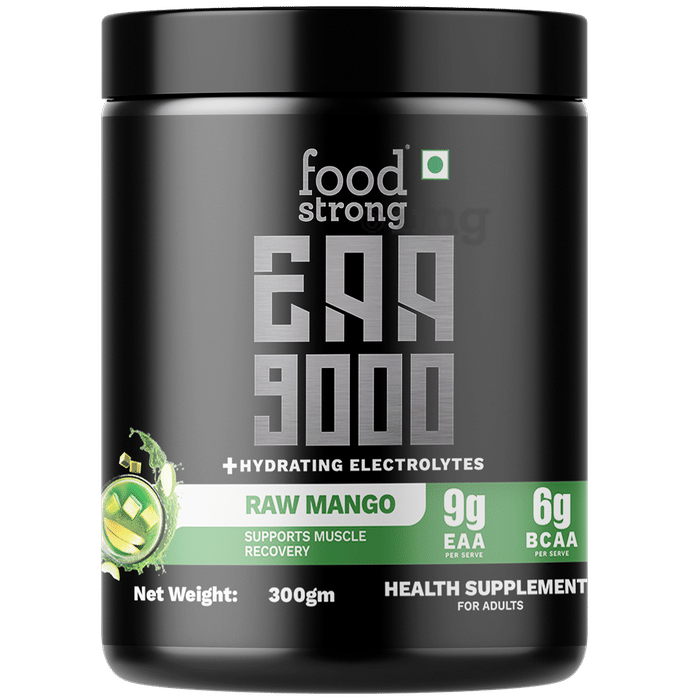 Foodstrong EAA 9000 + Hydrating Electrolytes Powder Raw Mango is a powdered health supplement for adults, formulated with a blend of Essential Amino Acids (EAAs) and Branched Chain Amino Acids (BCAAs). Each 12g serving provides 9.3g EAAs, including 6g BCAAs like L-Leucine, L-Isoleucine, and L-Valine, which may support muscle recovery and amino acid replenishment. The addition of electrolytes—Sodium, Potassium, and Chloride—may assist in hydration balance. Offered in a raw mango flavour, the supplement contains 25 servings in a 300g pack and is designed to support nutritional intake during physical activity.
