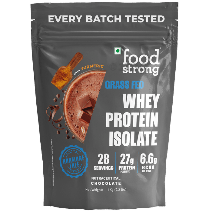 Foodstrong Grass Fed Whey Protein Isolate Powder Chocolate is a chocolate-flavoured protein powder formulated with whey protein isolate. Each 35 g scoop delivers 27 g of protein and contains ingredients such as jaggery, cocoa powder (4.5%), and enzyme-rich extracts like Curcumin (turmeric), Bromelain (from pineapple stems), and Papain (from papaya) to assist better protein digestion and absorption. This powder format can be stirred into cold or room temperature beverages and may help support daily protein intake when used regularly. Designed for convenience, it can be consumed at home or on the go as part of a routine fitness or nutrition plan.