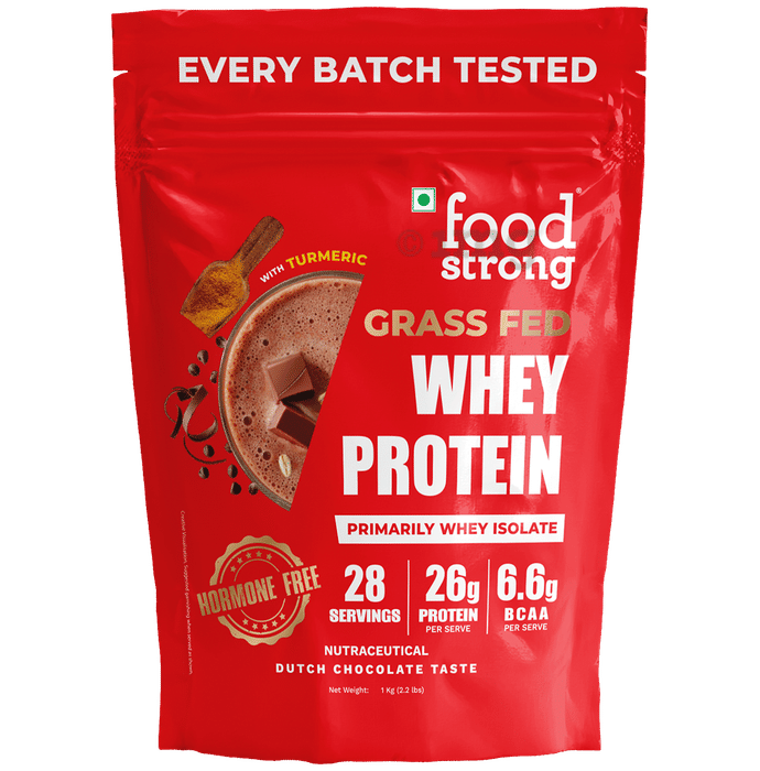 Foodstrong Grass Fed Whey Protein Primarily Isolate Powder Dutch Chocolate is a flavoured protein powder designed to be stirred into your daily beverage. Each 35 g scoop provides 26 g of protein and contains a blend of whey protein concentrate and isolate. It also includes ingredients such as Curcumin (turmeric extract), Bromelain (from pineapple stems), and Papain (from papaya) to assist in protein digestion and absorption. This dutch chocolate-flavoured powder format can be a convenient addition to your daily routine—simply mix into water or any preferred liquid and consume as directed.
