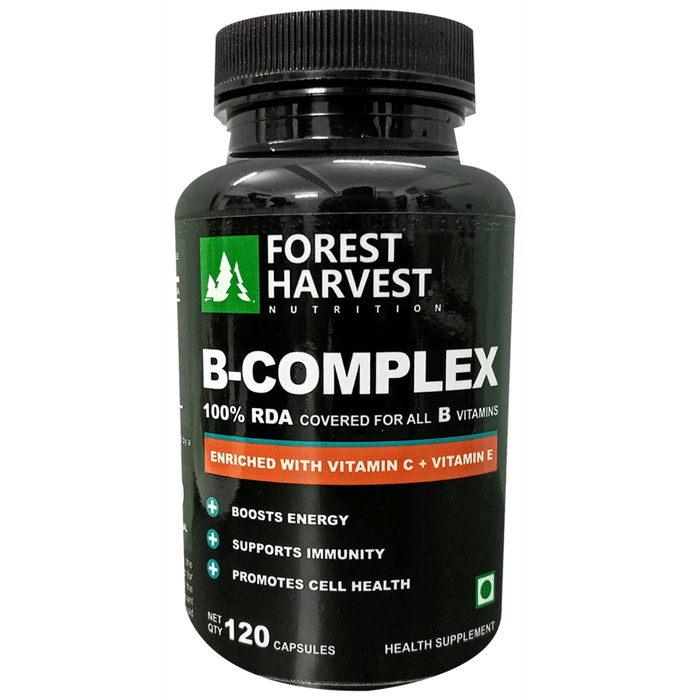 Forest Harvest B-Complex Capsule is a comprehensive vegetarian dietary supplement designed to support overall vitality. Enriched with Vitamin C and Vitamin E, this formulation can support natural energy metabolism, cellular health, and immune response. It combines essential B-complex vitamins, such as Biotin, Thiamine, Riboflavin, Niacin, and Folic Acid, with antioxidant-rich Vitamin C and E. This combination is crafted to help meet daily micronutrient requirements for individuals with active lifestyles, dietary restrictions, or wellness goals. With its gluten-free, preservative-free, and colour-free formulation, this capsule can support clean daily nutrition.