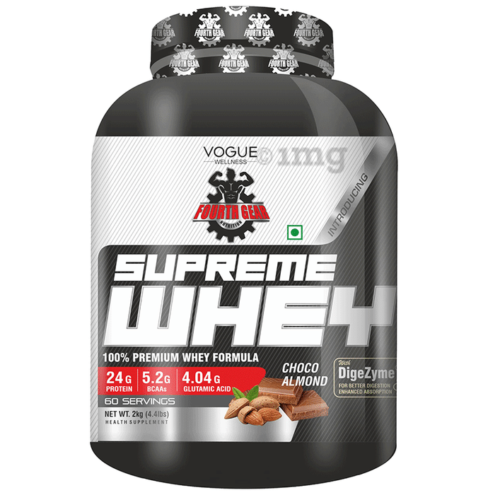 Fourth Gear Nutrition Supreme Whey Powder Choco Almond is a protein health supplement tailored for adult men seeking nutritional support for their workout routines and muscle development goals. This formulation contains a powerful blend of whey protein concentrate and whey protein isolate that delivers 24g of protein per 33g serving. It also offers a concentrated dose of BCAAs (5.2g) and glutamic acid (4.04g) per serving, making it suitable for those with active training regimens. The addition of DigeZyme®, a multi-enzyme complex, can help support better digestion and nutrient absorption, allowing the body to make the most of every scoop. With a delectable Malai Kulfi flavour and a formulation that is gluten-free, sugar-free, and soy-free, this product can be useful for fitness-conscious individuals looking to complement their exercise and dietary plans with a convenient protein option.