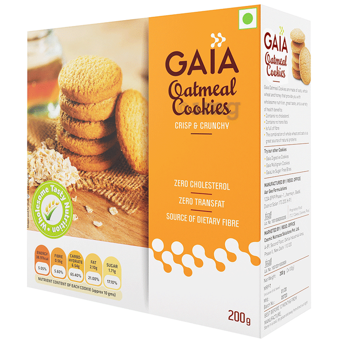 Gaia Oatmeal Cookies are made of oats, whole wheat and honey that taste good while they provide you with a variety of health benefits like improving heart health and easing digestion. Their rich fibre content keeps you feeling full for longer durations, proving to be a perfect little dose of nutrition food.