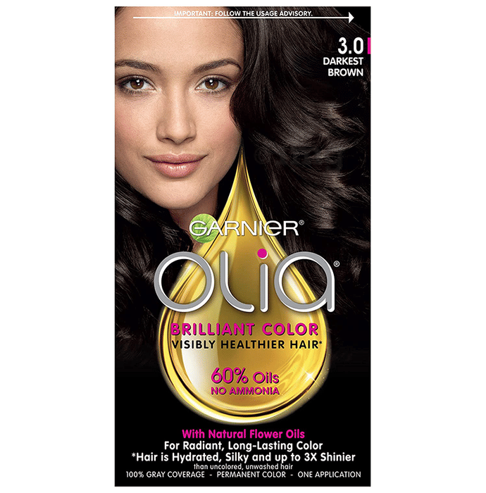 Garnier Olia Brilliant Color 3.0 Darkest Brown uses an exclusive 60% oil blend, with natural flower oils in the colorant. The unique oil-based formula propels colourants deep into the hair without ammonia, for pure, vivid, long-lasting colour. Olia helps you achieve maximum colour performance while the oils help reverse roughness and dullness, visibly improving and restoring hair.