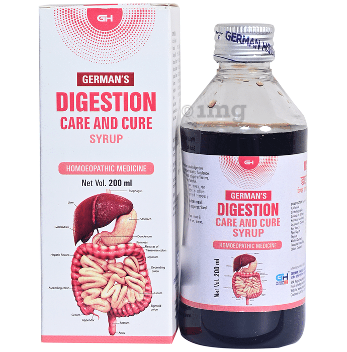Germans Digestion Care and Cure Syrup is an effective formulation to regularise the digestive system. It can be used for acidity, flatulence, nausea, vomiting and cramps in the abdomen. The product also provides relief from the after-effects of alcohol.
