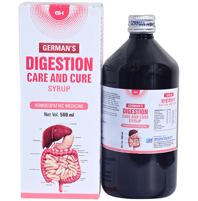 Germans Digestion Care and Cure Syrup is an effective formulation to regularise the digestive system. It can be used for acidity, flatulence, nausea, vomiting and cramps in the abdomen. The product also provides relief from the after-effects of alcohol.