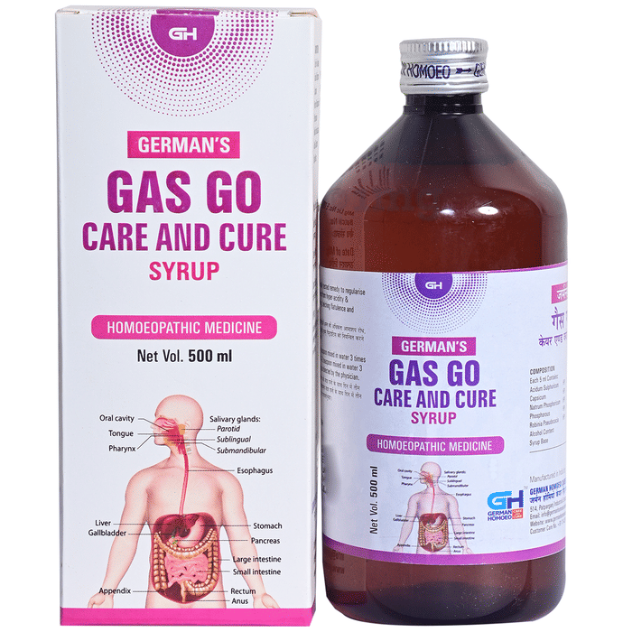 Germans Gas Go Care and Cure Syrup is a clinically tested remedy to regularize the digestive system. It relieves hyperacidity, dyspepsia, nausea and vomiting. The syrup also helps with flatulence and cramps.