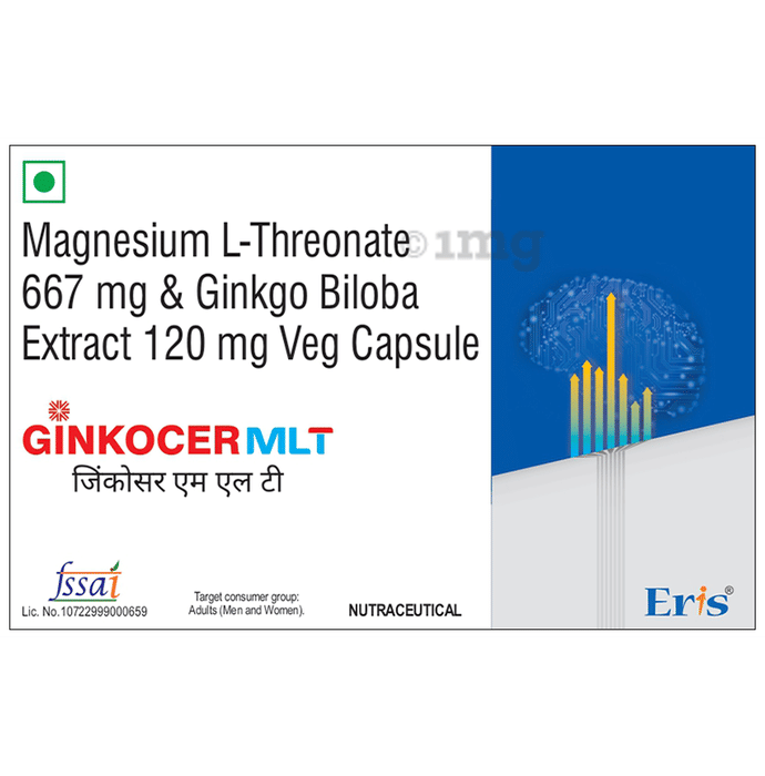 Ginkocer MLT Capsule is a nutraceutical supplement formulated to provide a highly bioavailable form of magnesium along with ginkgo biloba extract for general brain and nervous system support. It helps support memory, focus, and overall cognitive performance while contributing to normal nerve function and cellular protection from oxidative stress. This formulation is intended for individuals looking to supplement dietary magnesium intake and support normal cognitive function during increased mental demand or suboptimal nutrient intake, alongside a balanced diet. This product is not intended to diagnose, treat, cure, mitigate, or prevent any disease or medical condition.