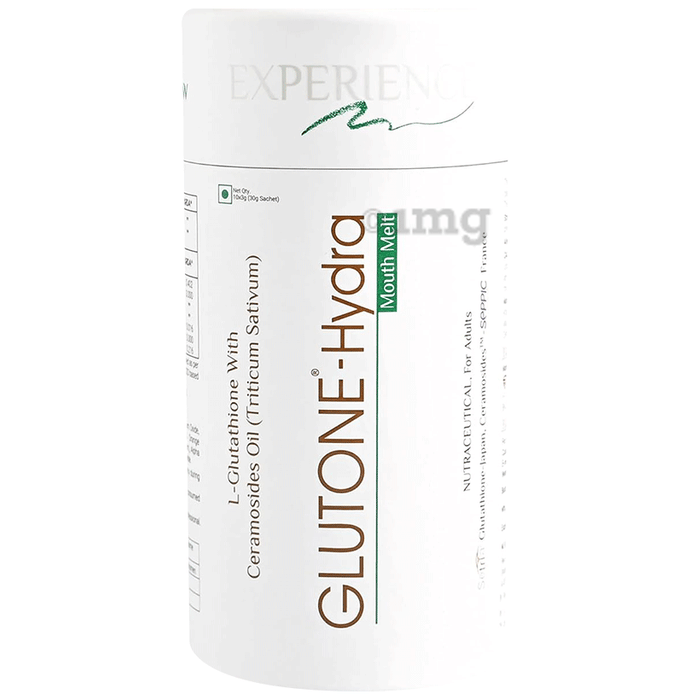 Glutone Hydra Mouth Melt (3gm) 10 Each combines Setria® L-Glutathione and Ceramosides™ Oil (Triticum Sativum) to support glowing, hydrated, and supple skin. Crafted for adults, it features a convenient sachet format with no artificial additives. Each serving is designed to improve ceramide levels, enhance hydration, and reduce dryness for a refreshed appearance.