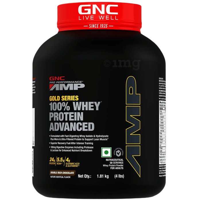 GNC Amp Gold 100% Whey Protein Advanced Powder is formulated with fast-digesting whey isolate and whey hydrolysate. Hydrolysed whey peptides can help in absorption and nutrient uptake. It provides 5.5 gm of branched-chain amino acids to help with recovery and performance. It also provides 4 gm of glutamine and glutamine precursors to aid in maximising muscle recovery, which is important for hydrating and fueling muscle cells and maintaining proper absorptive function in the digestive system. The 100 gm digestive enzymes with amino gen and lactase work to improve nutrient breakdown.