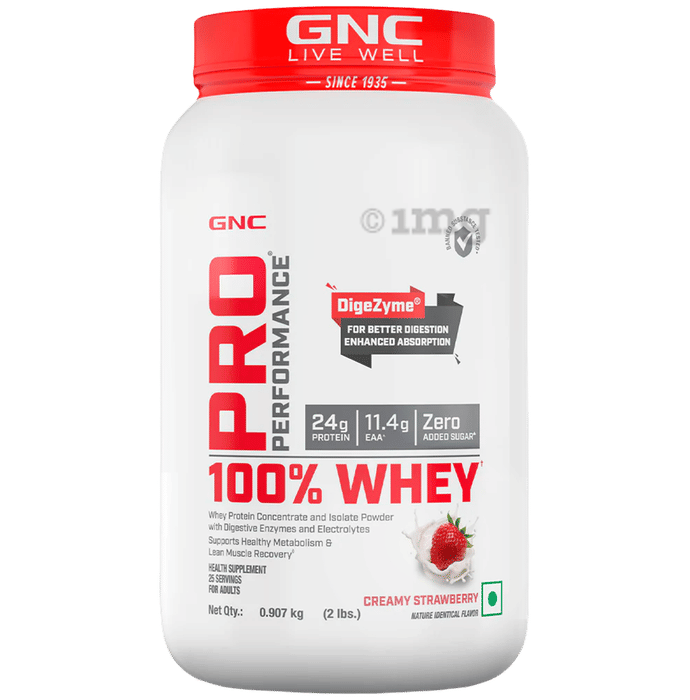 GNC Pro Performance 100% Whey Protein | With Digestive Enzymes & Electrolytes | For Metabolism & Lean Muscles Recovery | Flavour Powder Creamy Strawberry