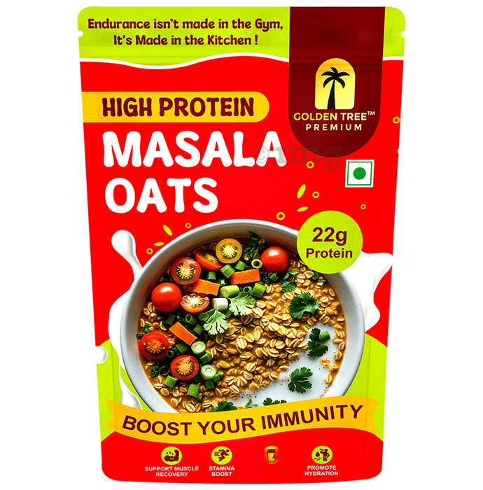 Golden Tree Premium High Protein Oats Masala offers a warm and savoury meal option made from whole grain oats seasoned with aromatic spices and real dehydrated vegetables. It may help provide balanced nutrition with plant-based protein, dietary fibre, and bold flavours from authentic masala spices. This product is designed to serve as a quick and nourishing meal suitable for different times of the day.