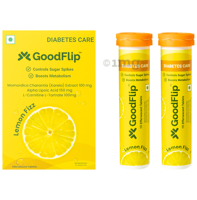GoodFlip Diabetes Care Effervescent Tablet Lemon Fizz is formulated with ingredients such as gymnema sylvestre, alpha lipoic acid, karela extract, and other botanicals. This product can help control and regulate blood sugar levels. It can be consumed as a daily supplement in the form of effervescent tablets with a refreshing lemon fizz flavour.