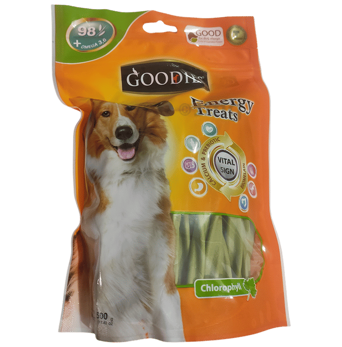 Goodies Pet Food Energy Treats Chlorophyll is a soft and chewable dog treat made with vegetable protein and chicken liver enhancer. Designed to be digestible and suitable for dogs across all breeds and age groups, it offers a flexible texture that can be fun to chew. The blend includes chlorophyll, calcium, bromelain enzyme, and fructo-oligosaccharide, along with vitamins and minerals. These treats can be given as a reward or as a light snack between meals.