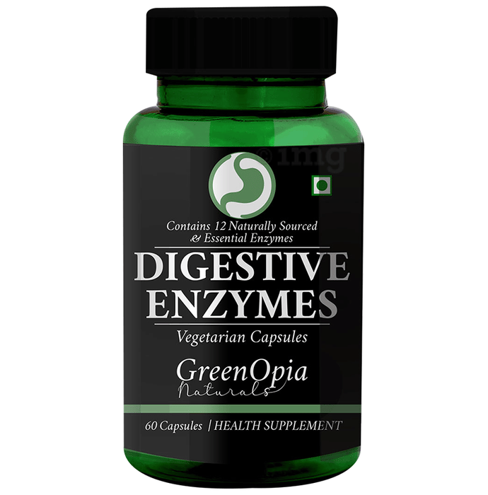 Greenopia Naturals Digestive Enzymes Vegetarian Capsule is a plant-based formulation crafted with a blend of 12 naturally sourced enzymes. It includes Amylase, Papain, Lactase, Protease, Glucoamylase, Cellulase, Diastase, and Invertase, which can help support the breakdown of proteins, carbohydrates, fats, and fibres. Designed for everyday digestive comfort, this enzyme supplement may assist in nutrient assimilation and digestion after meals, especially following high-fat or dairy-based foods.