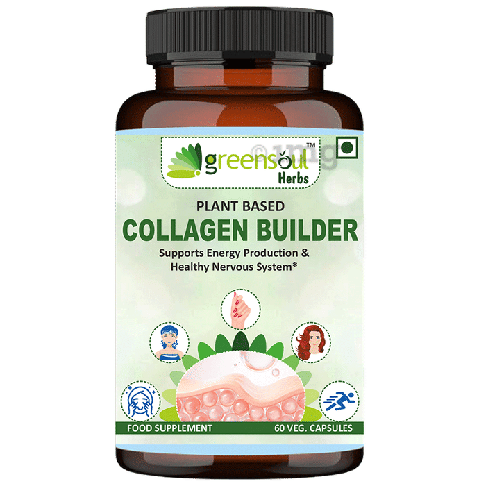 Greensoul Herbs Plant Based Collagen Builder Veg Capsule is a dietary food supplement made with a synergistic blend of nutrient-rich botanicals and essential micronutrients. This formulation is crafted to support collagen synthesis through plant-based ingredients that provide co-factors such as vitamin C, zinc, biotin, and silica. It is designed for individuals looking to incorporate a plant-derived supplement that can help support the health of hair, skin, joints, and energy levels as part of a balanced lifestyle. The formula may support energy production and may help maintain a healthy nervous system as well.