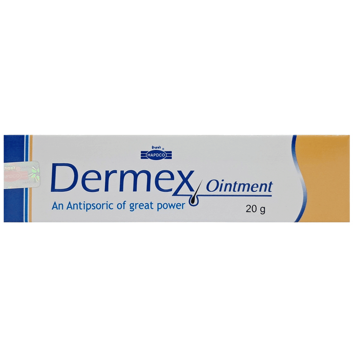 Hapdco Dermex Ointment heals various skin problems. It is helpful in erythema, ulcers, wounds, eczema, itching, cracks, fissures, eruptionpustular, unhealthy skin, rawness in bend of limbs, groin, neck and behind ears.