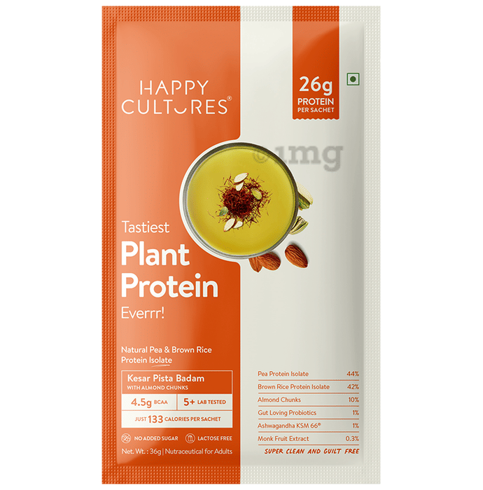 Happy Cultures 26g Plant Protein Powder Kesar Pista Badam is a plant-based protein blend made from Pea Protein Isolate, Brown Rice Protein Isolate, and real almond pieces, enriched with KSM-66 Ashwagandha. Crafted for clean and delicious nutrition, it provides 26 g protein per sachet along with probiotics, digestive enzymes, and monk fruit extract for natural sweetness. It supports lean muscle growth, digestion, and routine post-workout recovery while being vegan, lactose-free, and free from added sugars.