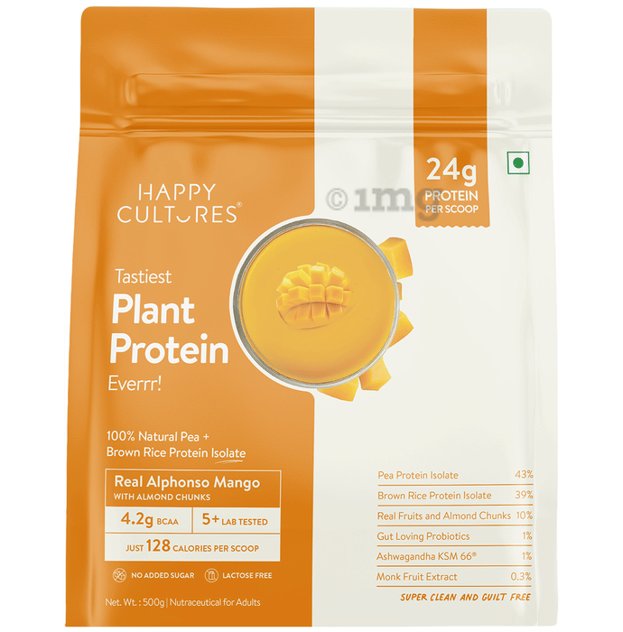 Happy Cultures Plant Protein Mango provides 24g plant-based protein isolate per serving, sourced from pea and brown rice. It contains amino acids, including 4.2g BCAAs, and is formulated for muscle growth, recovery, and everyday wellness for both women and men. The blend includes added digestive enzymes and probiotics for comfortable digestion. It is sweetened with monk fruit extract and contains natural flavours and almond chunks for taste, without added sugar or lactose.