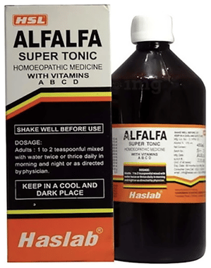 Haslab Alfalfa Super Tonic is a homoeopathic liquid containing Alfalfa, Avena Sativa, Hydrastis Can, Cinchona Officinalis, Terminalia Arjuna, Crataegus, Digitalis P., Cactus G., Strophanthus, Lycopodium, and Riboflavin in a syrup base. It is formulated to support mild and temporary tiredness, general body comfort, and brief sensations of weakness in adults. The preparation may help maintain overall comfort and ease occasional fatigue in a neutral and supportive manner.