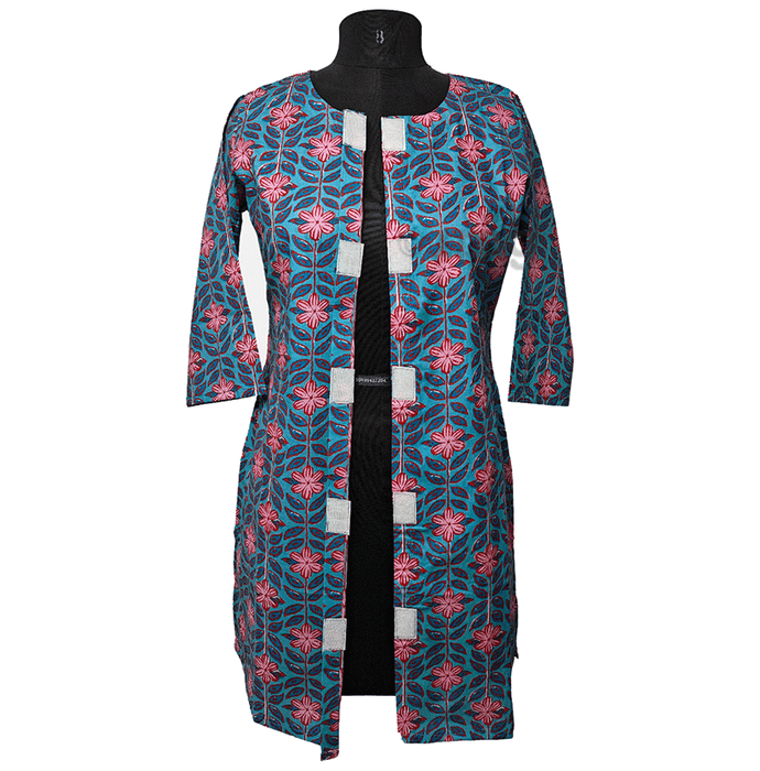 Haxor Velcro Short Kurti 02 Women's 3/4 Length Sleeve Printed Front Open Adaptive Tunic | Round Neck Front Open Kurti Blue Medium