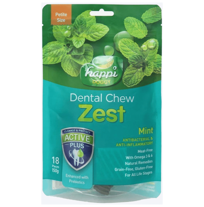 Heads Up For Tails Happi Doggy Dental Chew Zest Antibacterial & Anti-Inflammatory Mint are ideal to counter doggy breath. These mint treats have germicidal properties that are great to freshen breath. They also have vitamins A, M, H and E. Mint is also known for relieving stomach pain and nausea. These dental chews remove plaque and tartar stains as your pet chews on them!