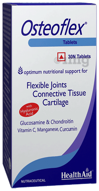 HealthAid Osteoflex Tablet are formulated with glucosamine, chondroitin, hyaluronic acid, vitamin C, manganese, and turmeric in a convenient tablet format. This combination of ingredients is commonly included in daily nutritional supplements designed for joint and cartilage wellness. Vitamin C contributes to normal collagen formation for the normal function of cartilage, while the formula is designed to complement an active lifestyle and balanced diet. The 90 tablet pack offers a convenient option for regular supplementation.