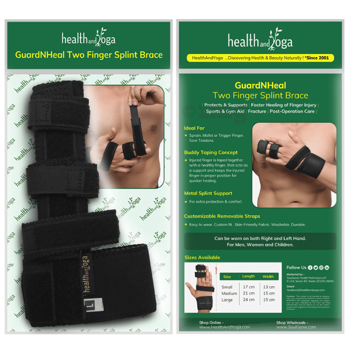 HealthAndYoga GuardNHeal Two Finger Splint Brace is a finger splint made of breathable and lightweight padded sponge foam and drytex material to provide support to injured fingers and protect the existing fractures. Two finger brace works with the same philosophy as buddy taping. Buddy taping is an effective technique that involves taping your damaged finger together with a healthy finger. This allows your healthy finger to act as a splint, keeping your injured finger in a natural position for healing.