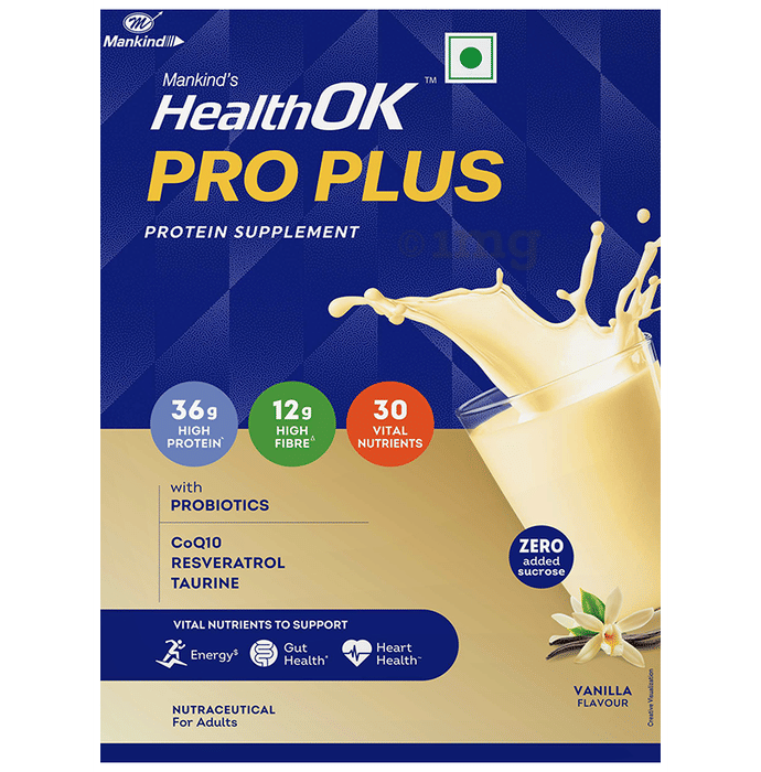 Mankind's HealthOK Pro Plus is a High Protein High Fibre supplement with dual blend of Probiotics and 30 vital nutrients to support active lifestyle.