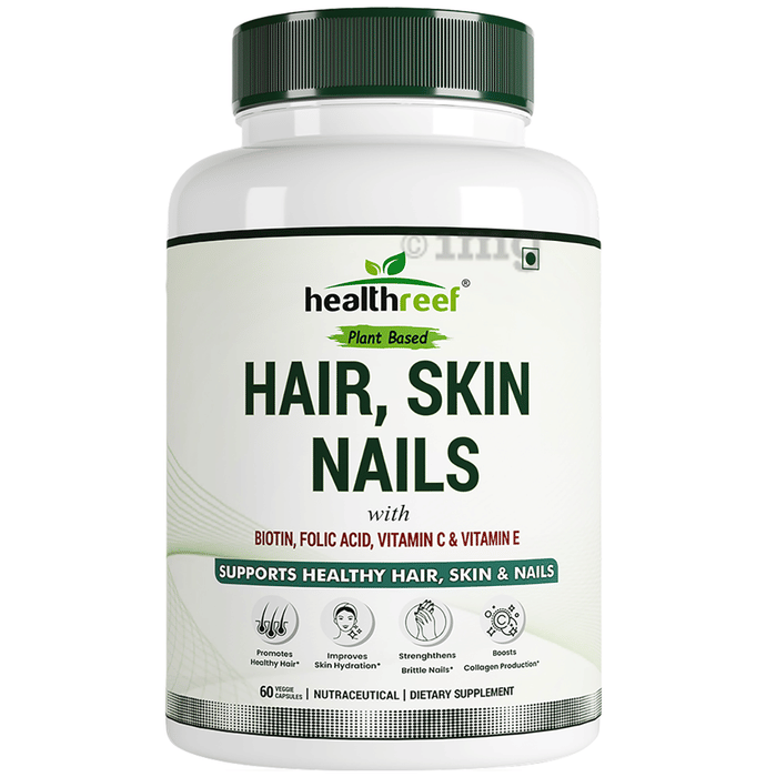 Healthreef Plant Based Hair, Skin, Nails with Biotin, Folic Acid, Vitamin C and Vitamin E Veggie Capsule is a nutraceutical formulation that combines essential vitamins and plant-derived nutrients to support the normal structure and function of hair, skin, and nails. Biotin contributes to the maintenance of normal hair and skin, while Folic Acid supports cellular processes including tissue repair. Vitamin C plays a key role in collagen formation and antioxidant support, and Vitamin E contributes to the protection of cells from oxidative stress. Additional ingredients such as Zinc, Copper, and plant-based extracts from Sesbania, Amla, and Spirulina further complement the formula. This product is offered in vegetarian capsules and may be included in a daily wellness regimen.