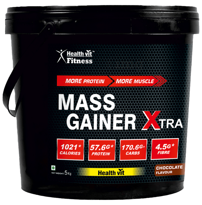 HealthVit Mass Gainer Xtra with Vitamins & Minerals Powder Chocolate is a balanced blend of high-quality protein and carbohydrates. The Protein content in each serving helps you to rebuild the muscle tissue, and the rich carbohydrates give you energy and enhanced muscle power. It contains protein in each serving which triggers the synthesis of new muscle tissues and boosts muscle recovery. This balanced blend fulfils your daily requirement of calories that replenish glycogen stores to support your workout. It contains protein filled with amino acids, which enhances your workout.