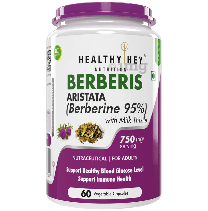 HealthyHey Berberis with Milk Thistle Vegetable Capsule is a nutraceutical formulation designed to support general health and wellness. Each serving contains 500 mg of Berberis Aristata Root Extract, standardised to 95% Berberine, and 250 mg of Milk Thistle Extract, standardised to 80% flavonoids. These ingredients are traditionally used to help maintain overall wellness and support metabolic balance. Free from added sugars and artificial preservatives, this supplement is suitable for vegetarians and should be used as per the advice of a healthcare professional.