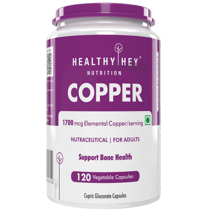 HealthyHey Nutrition Copper 1700mcg Vegetable Capsule is filled with copper which is an essential trace mineral. It is essential for the formation of collagen that helps support connective tissues like skin, bone, cartilage and tendons. chelated minerals are minerals that have been combined with amino acids to form “complexes”. This formulation provides a patented, highly bioavailable form of chelated copper. It is gluten, wheat and dairy-free product. Solgar Chelated Copper is non-GMO, vegan, kosher and free of gluten, wheat, dairy, soy, yeast, sugar, sodium, artificial flavour, sweetener and colour.HealthyHey's Manufacturing Unit is Certified by GMP, FSSC 22,000 & FSSAI.