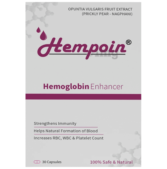 Hempoin Haemoglobin Enhancer Capsule is formulated from the fruits of Opuntia vulgaris. It works as a hemoglobin enhancer. It caters to various issues of the body. Opuntia fruits are traditionally recognised for alleviating Vata Kapha dosa and addressing issues due to vitiated Rakta (Anemia), cyst, pain, inflammation and cough as per Traditional Knowledge Digital Library (TKDL).