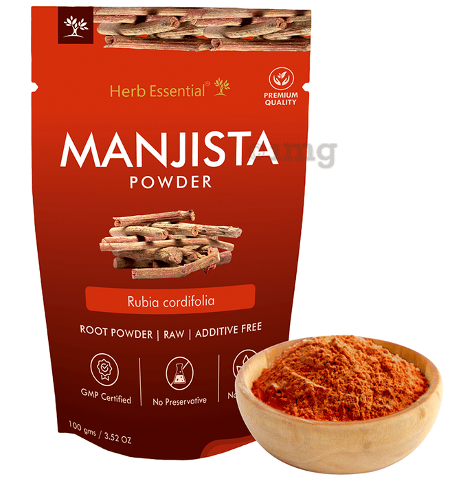 Herb Essential Manjistha Powder helps reduce the appearance of blemishes and age-related dark spots while eliminating toxins from the scalp and nourishing the hair. It enhances blood circulation and addresses skin discolouration. This powder effectively combats freckles, pimples, wrinkles, and blemishes.