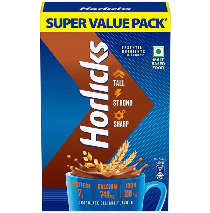 Horlicks Chocolate Delight is a chocolate-flavoured malt-based drink mix which can help provide essential nutrients as part of a regular diet. This product can be enjoyed with milk and is suitable for consumption hot or cold, making it a tasty and nutritious option for daily use.