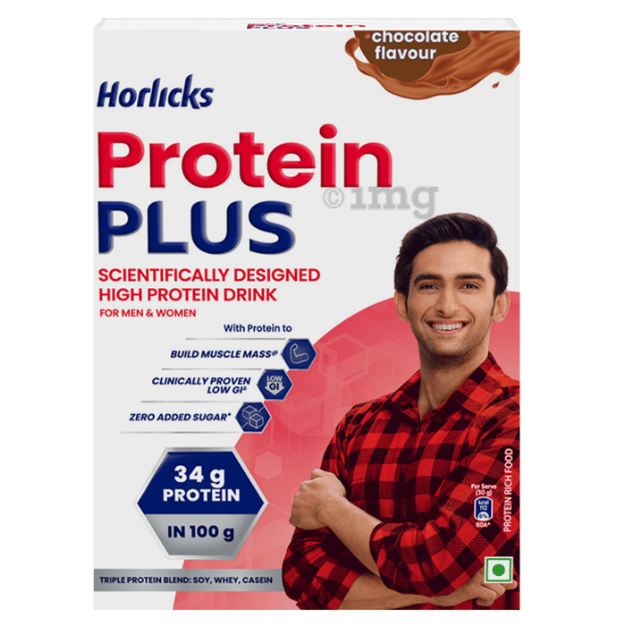 Horlicks Protein Plus is a health drink with a blend of protein-rich ingredients (whey protein concentrate, soy protein isolate, sugar, cereal extract, casein), minerals, and vitamins. Horlicks Protein+ is scientifically formulated for providing daily nutrition to adults and contains 3 times more protein than the leading HFD.