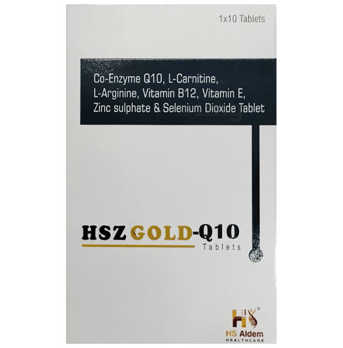 HSgold Q-10 Tablet is a health supplement and adjuvant therapy. It is used to maintain overall health and well-being. The tablet contains various ingredients, including Co-Enzyme Q10, L-Arginine, Vitamin E, Lycopene, Levo-carnitine, and Vitamin B12. Co-enzyme Q10 is a compound that plays a role in energy production in cells. L-arginine is an amino acid that may have various health benefits. Vitamin E is an antioxidant that helps protect cells from damage.