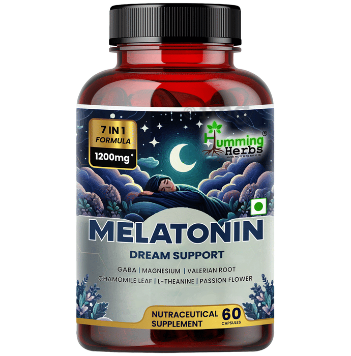 Humming Herbs Melatonin Capsules is a supplement that may help support a healthy sleep cycle and relaxation. Each capsule contains a 7-in-1 blend, including Melatonin, Magnesium Glycinate, GABA, L-Theanine, Valerian Root, Chamomile Leaf, and Passion Flower Extract, which can help with sleep quality and calmness. This vegetarian formula is designed for those looking to maintain restful sleep and manage stress naturally.