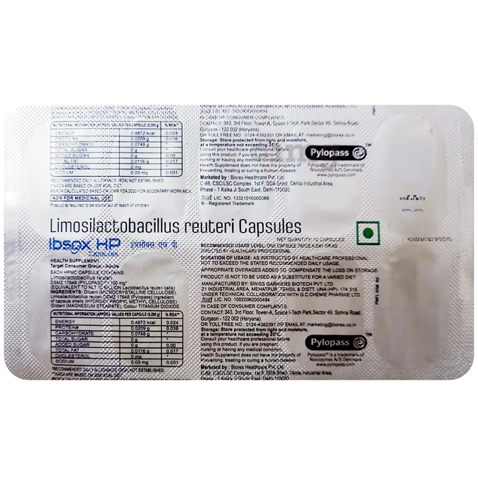 Ibsox HP Capsule is a vegetarian health supplement formulated to help support digestive wellness using a specific probiotic, Limosilactobacillus reuteri. Designed for daily use, this capsule offers a targeted approach for maintaining microbial balance in the stomach. The inclusion of L. reuteri may help provide stomach comfort without significantly altering gut flora overall. Ibsox HP Capsule can help support stomach health as part of a balanced lifestyle.