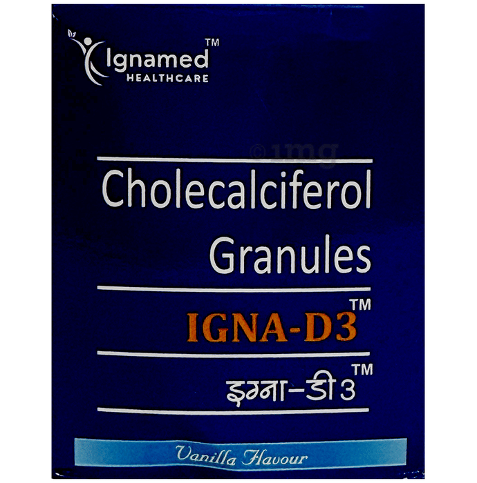 Igna-D3 Granules Vanilla is a high-strength vitamin D3 supplement formulated to help support bone strength, immunity, and overall well-being. Each sachet provides 60,000 IU of Cholecalciferol (Vitamin D3), making it suitable for individuals with Vitamin D deficiency or increased nutritional requirements. The granules dissolve easily and come in a pleasant vanilla flavour for convenient consumption.