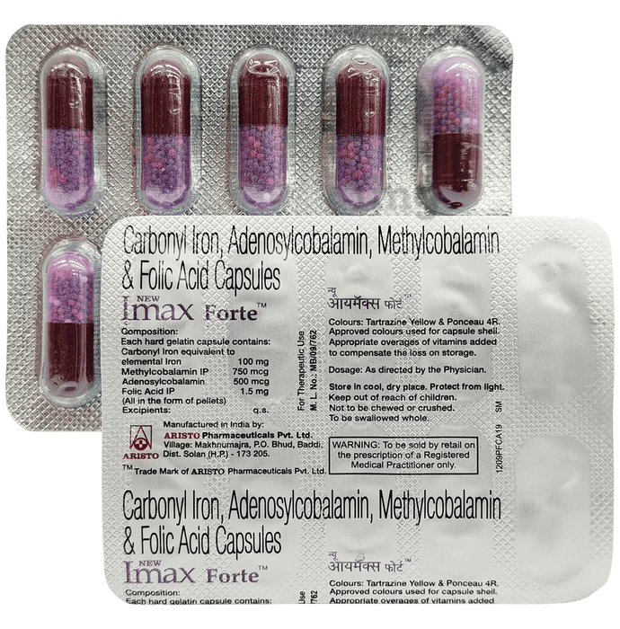 Imax Forte Capsule contains Iron, Methylcobalamin, and Folic acid. These three are important substances required by the body to make more blood cells. Iron is an important mineral in the body required by red blood cells to carry oxygen to other body cells and tissues.