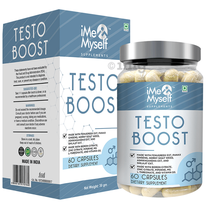 iMeMyself Testo Boost Capsule is a nutraceutical formulation containing a blend of vitamins, minerals, and plant-based adaptogenic herbs. The Fenugreek, Gokshura, and Mucuna Pruriens can help support stamina, strength, and muscle recovery. The Ashwagandha, and Panax Ginseng support hormonal balance, energy, and stress resilience. The combination of these ingredients helps support workout recovery, endurance, and overall male vitality.