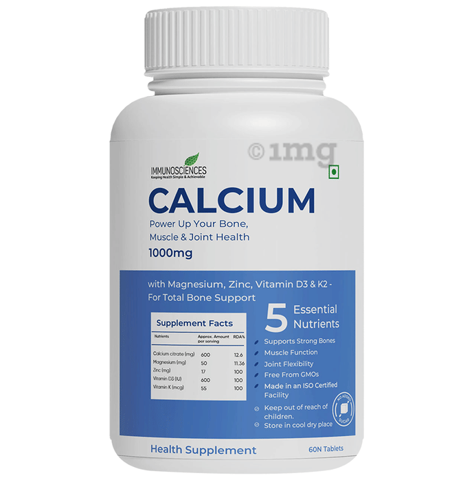Immunosciences Calcium Tablet is a dietary supplement that provides a concentrated dose of calcium, an essential mineral that plays a vital role in maintaining strong bones and teeth. Each tablet contains a balanced amount of calcium, along with other nutrients that aid in its absorption and utilisation by the body. It is designed to supplement calcium intake for individuals who may not obtain enough through their regular diet or have increased calcium needs. The tablet is easy to swallow and allows for convenient daily supplementation to ensure an adequate intake of calcium.