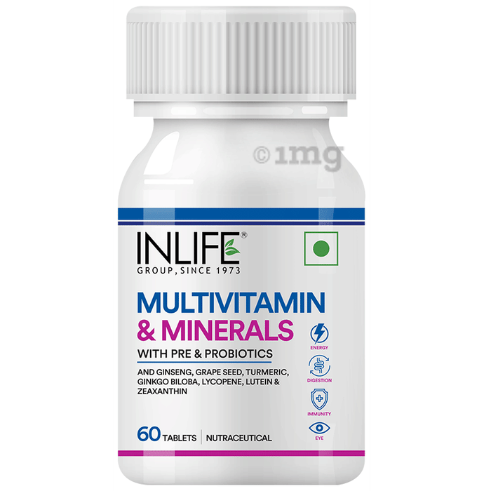 Inlife Multivitamin & Minerals with Pre & Probiotics Tablet is a unquie combination of essential vitamins and minerals along with digestive blend, immunity blend and eye health blend that offers complete protection to your body. It contains essential vitamins like vitamimn B Complex, Biotin, Folic Acid, Vitamin C, D, E, K, and minerals like Calcium, Zinc, Iron Iodine, Selenium to statisfy your daily nutrient requirement. It also contains multivitamins with Prebiotics and Probiotics, L-Glutamic acid for healthy gut and digestive health. This product contains added Ginseng, Ginkgo Biloba and Turmeric Extract along with Lycopene to help boost your immunity.