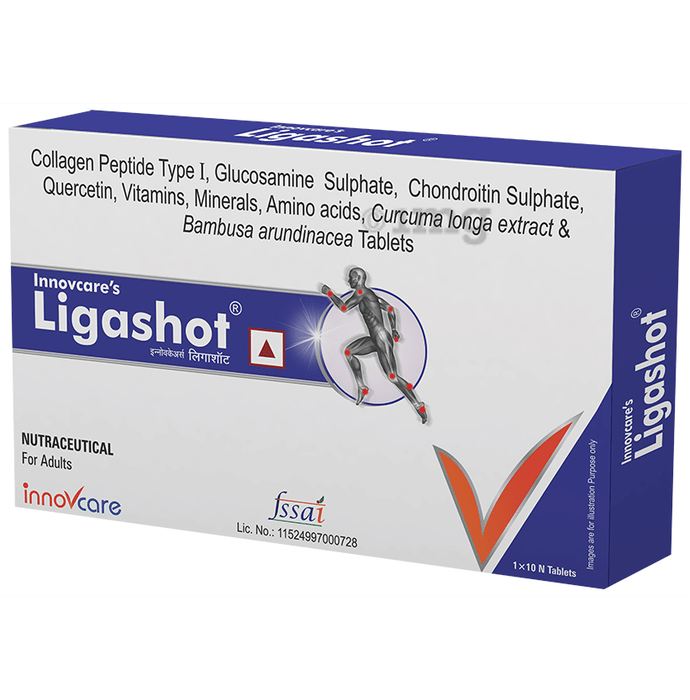Innovcare's Ligashot Tablet is a comprehensive joint and ligament support supplement that may help improve mobility, manage inflammation, and strengthen connective tissues. With a rich blend of ingredients like Glucosamine Sulphate, Chondroitin Sulphate, Collagen Peptide, Curcumin, and essential amino acids and minerals, Ligashot can help support cartilage regeneration, joint lubrication, and tissue repair. This potent formula also includes antioxidants such as Quercetin and Vitamin C, which may help protect joints from oxidative stress, while Bambusa vulgaris adds natural silica which may help promote joint elasticity. Designed for individuals with joint pain, stiffness, or ligament stress, Ligashot can help support long-term joint and musculoskeletal health.
