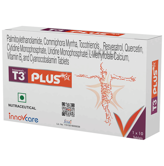 Innovcare's T3 Plus Tablet is a targeted nerve support supplement that can help manage pain, aid nerve regeneration, and support cognitive and emotional well-being. Enriched with Palmitoylethanolamide (PEA) and Commiphora myrrha, this formulation offers natural anti-inflammatory and analgesic effects that may help relieve nerve discomfort. It also includes potent antioxidants such as Tocotrienol, Resveratrol, and Quercetin, which can help manage oxidative stress in nerve tissues. Neuro-nutrients like Cytidine Monophosphate and Uridine Monophosphate may help aid in nerve cell repair and regeneration, while L-Methylfolate Calcium, Vitamin B6, and Vitamin B12 (Cyanocobalamin) can help support mood, neurotransmitter activity, and nerve function.