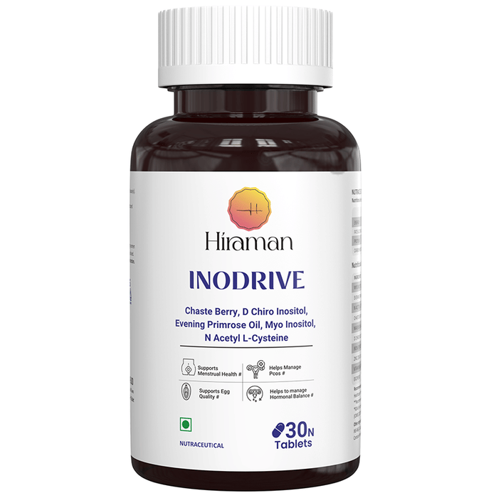 Hiraman Inodrive Tablet is a nutraceutical supplement formulated to support women’s health, focusing on hormonal balance. This vegan supplement contains key ingredients like Myo Inositol, Evening Primrose Oil, and N-Acetyl L-Cysteine.